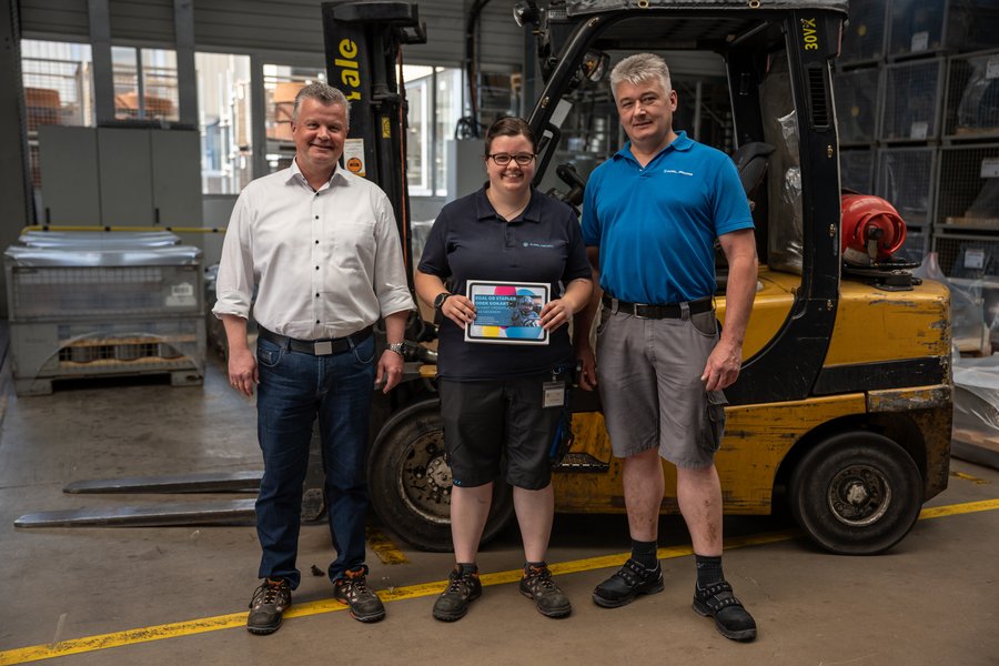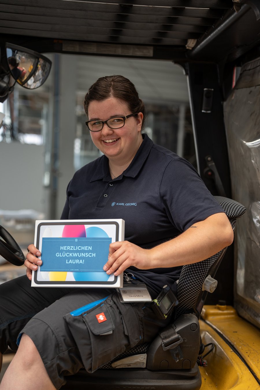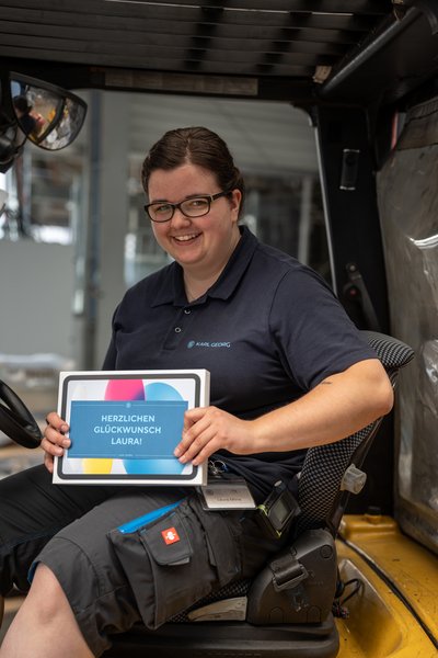 Wir freuen uns, dich als ausgebildete Fachkraft für Lagerlogistik und als festes Teammitglied bei Karl Georg begrüßen zu dürfen. Hier an ihrem Arbeitsplatz – dem Gabelstapler – beherrscht Laura ihr Handwerk. Ihre Leistung in der Abschlussprüfung war einfach hervorragend. 🚀 Im Rahmen unserer digitalen Ausbildungsinitiative erhält jeder Auszubildende ein Tablet zum Lernen und für die Schule – und darf es auch nach dem Abschluss behalten. Laura hat bereits verraten, wie sie es in Zukunft nutzen möchte.